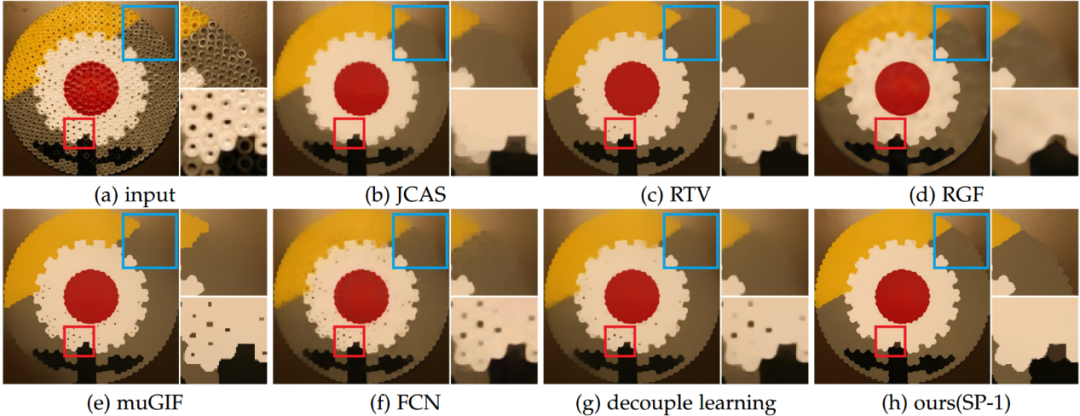 第四类任务主要为结构保持滤波任务,如图像去纹理。这类算法要求保持显著性结构即使其对应的边界很弱,同时平滑掉小的结构即使其对应的边界很强。这种平滑特性要求与前三类任务完全不同,前三类任务要求保持显著性边界,而第四类任务要求保持显著性结构。