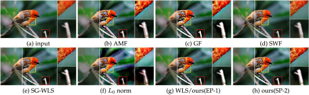 对于第四类任务,我们将算法应用于图像去纹理,实验结果及对比如图8所示。可以看出我们的算法在去除强边界的小纹理结构和保持弱边界的大纹理结构方面有着优于其他算法的表现。