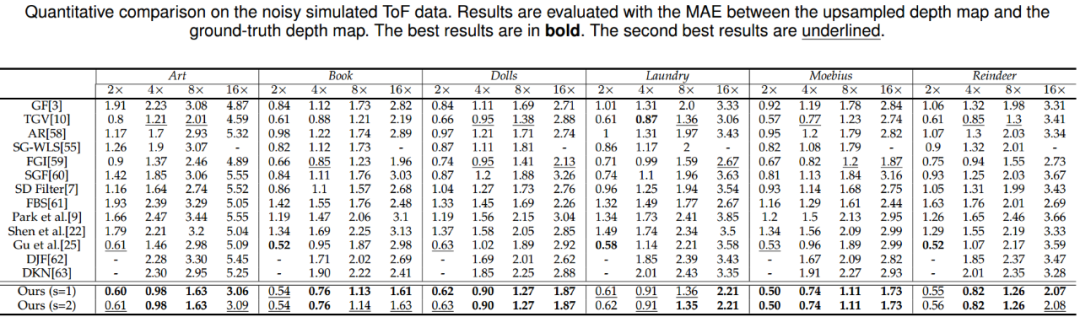 对于第三类任务,我们将算法应用于引导深度图超分辨,实验结果及对比如图7所示,同时下列表格中展示了量化对比。可以看出我们的算法取得了当前最好的实验结果。