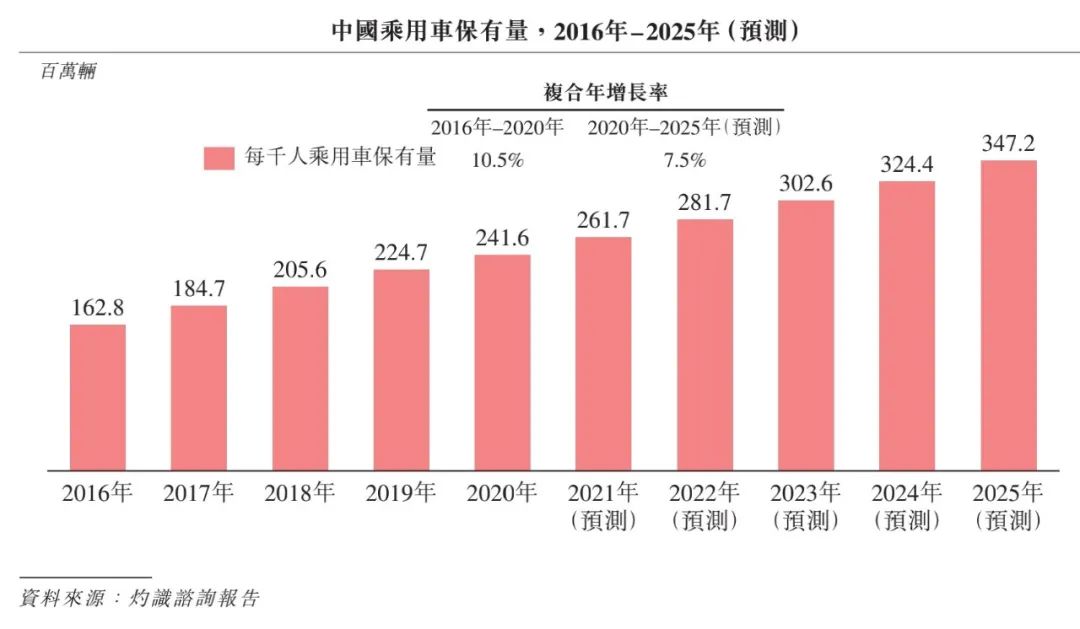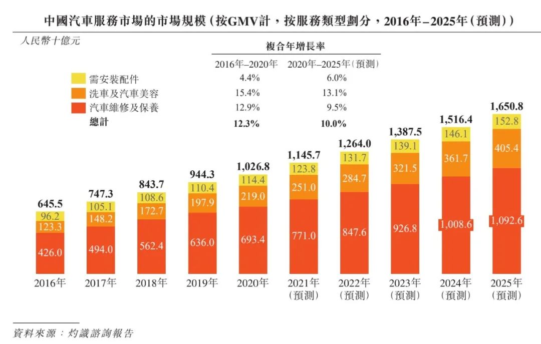 其押注的汽车后市场服务,更是一条前景广阔的赛道。根据灼识咨询报告,汽车服务市场2020年规模为1万亿元,预计2025年达到1.7万亿元,复合年增速达10%。