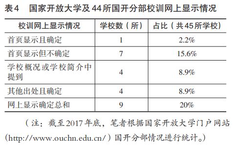 截至2017 年底,笔者在国家开放大学门户网站,浏览国家开放大学及其 44 所国开分部和电大,试图从“首页”“学校概况( 学校简介)” “校园文化”等导航条中分别查询到开放大学整个系统的校训文化现象(见表4)。结果显示,在全国开放大学系统,能够确定有校训的学校只有 9 所。多数国开分部和电大虽然都设有“校园文化” 栏目,但却未明确提及校训文化。中外大学都十分 重视校训文化建设,哈佛大学的校训是“与亚里士多德为友,与柏拉图为友,与真理为友”,高度凝 练了学校的核心价值理念。武汉大学首页设置“武大标识”栏目,包括校名、校徽、校训、校歌、校庆日,校训“自强、弘毅、求是、拓新”非常醒目。南开大学在南开概况栏目中,设有校徽、校 训、校旗、校歌等标识,明确校训是“允公允能, 日新月异”,且加以解释和说明。显然,校训不应该是在“字缝隙”里寻找的东西,它是学校理念识 别、视觉识别、行为识别的现象标识,在网络时 代,任何一所高校都应该在首页上一目了然地明示 其校训文化。