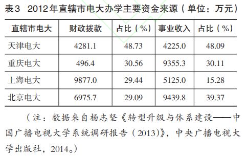 无论电大还是开放大学,所面临的最大挑战是人才培养质量问题。电大要切实解决学生“低进低出” 的现象,就必须从根本上解决以“学生数量维系生 存”的问题。如果把电大系统看作一座大厦,那么它 的地基究竟是什么,值得深思。20世纪70-80年代电大建校的地基首先是政府的财政投入(历史上各地电大与教委有着多种“藕断丝连”的关系,教育主管部门是政府扶持电大建校的初始支柱),其次是无数莘莘学子的求学梦和华罗庚教授精彩的第一课。然而, 随着市场经济的发展和各类高校招生规模的扩大,电大的地基在“隐性”地被“缩水”,生源减少了,生均拨款减少了,华罗庚式的授课渐行渐远了,而远程教育的硬件投入却增加了,只顾文凭的学生增加了。2012年全国省级电大财政拨款平均所占比例为40.6%(杨志坚,2014),以4 所直辖市电大为例,只有天津电大的财政拨款略超过了平均数(见表3),这就表明全国电大有一半以上的经费来源要靠自己“创收”,如 果学生“低进高出”,就等于生源走向断流,学校 “入不敷出”。除了教学经费不足外,还存在有些地方政府对电大的定位和作用不重视的现象,例如,54%的地市级电大和78%的县级电大均被整合到其他 教育机构(杨志坚,2014),这表明随着政府投入的减 少,电大原有的地基发生了动摇。以保证生源保持电大发展的“求生”之路,似乎理所当然。但当社会对电大的“含金量”提出质疑时,我们才意识到电大真正的地基是教育质量。所以,这些年开放大学 狠抓教学质量、考试质量,不断提高办学“含金量”,开放大学的质量文化建设正在走向成熟。