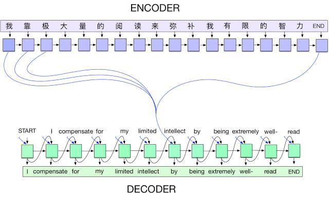 从汉语普通话到英语的seq2seq模型。在每个时间步长中,编码器接收一个汉字和自己以前的状态(黑色箭头表示),并产生一个输出向量(用蓝色箭头表示)。然后,解码器逐个生成英文翻译,每一步都会综合考虑最后一个字、先前的状态和编码器的所有输出的加权组合(也就是注意力[3],用蓝色标记),然后产生下一个英文单词。我们在实现中,使用 wordpieces[4]处理罕见的单词。