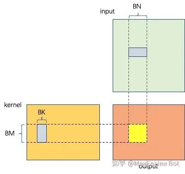 对于矩阵乘特别是大规模矩阵乘,cuBlas 等计算库已经优化的足够好了,基本上可以接近设备理论峰值,这里我们结合 Roofline 简单分析一下性能。为了充分适应硬件体系结构特征,充分利用多级存储增大访存带宽,我们需要对矩阵乘进行分块计算。如下图所示,假如 cuda 中每个 Thread Block 处理 BMxBN 的 output,此时 kernel 分块大小为 BMxBK,input 分块大小为 BKxBN。则计算量为 BM*BN*BK*2,访存量为 (BM*BK + BN*BK)*4。计算密度为 。按照 Roofline 模型的描述,计算设备的 FLOPs/Byte,若要达到设备理论峰值我们只要保证计算密度大于 IM 即可。如果我们按照 BM=32, BN=32 来算的话,则此时的计算密度将达到 8 FLOPs/Byte,显然是大于 IM 的。此时如果忽略 TP 的限制假如打满设备最大带宽,最大可能达到的性能 P = 8*2.16 = 17.28 TFLOPS。结合 Roofline 模型不难看出此时处于 Compute Bound 区域。由于 Compute Bound 区域的计算速度已经接近理论峰值,已经不能增加了。如果我们采用大 kernel 的话,随着 kernel size 的增加计算量会呈平方增长,所以相应的运行时间也会随之增长,这显然是不可接受的。