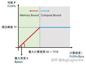 当应用的计算密度 I 超过最大计算密度 IM 时,此时无论应用的计算密度多大,它的性能最高只能达到计算设备的理论峰值 TP。此时应用的性能 P 被设备理论峰值限制无法和计算密度 I 成正比,所以叫做 Compute Bound。当应用的计算密度 I 小于最大计算密度 IM 时,此时性能 P 将由设备最大带宽和应用计算密度决定。不难看出对于处在 Memory Bound 区间的应用,增加设备带宽和增加计算密度可以使应用性能达到线性增长的目的。