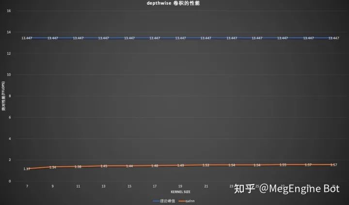 鉴于以上分析,大 kernel depthwise 卷积有很大的优化潜力,所以 MegEngine 紧跟学界动态对大 kernel depthwise 卷积进行了深度优化。如上图所示,经过我们的优化后,随着 kernel size 的增加,算子性能基本呈现线性增长的趋势,部分情况下算子可以逼近硬件的单精度浮点理论峰值。