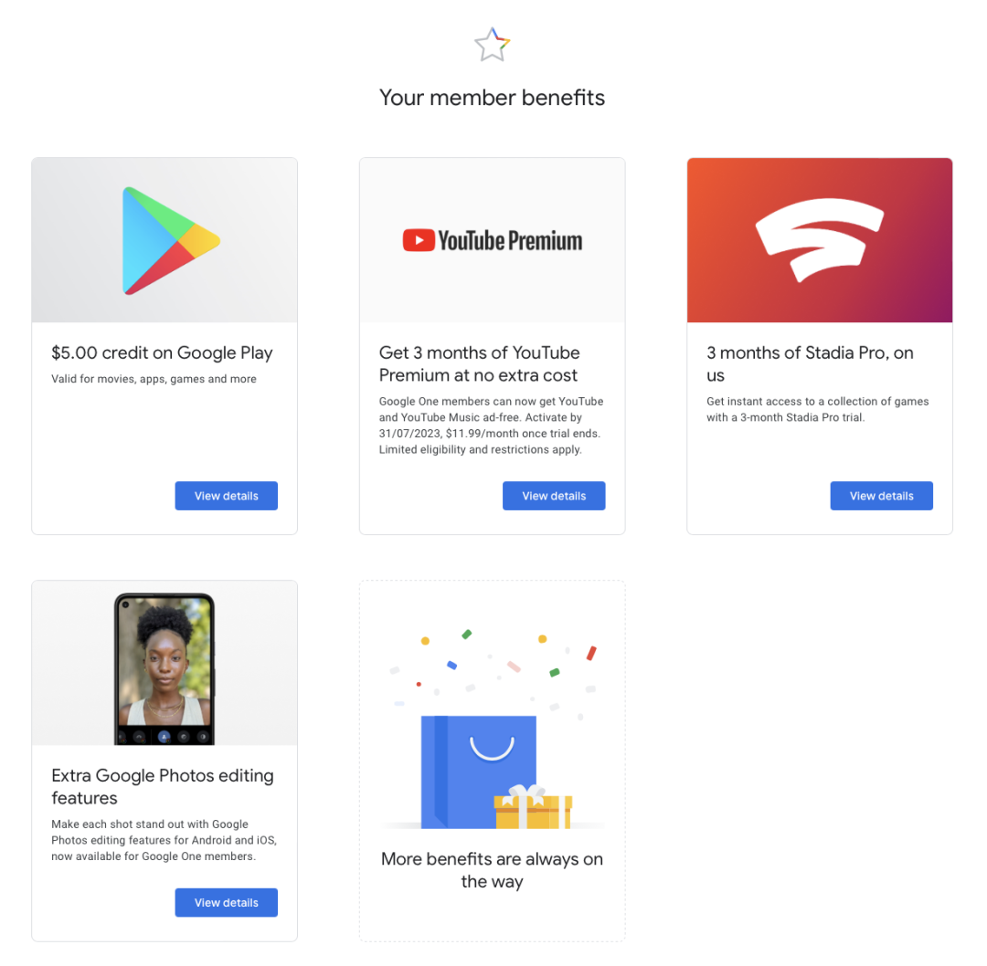 Google One 作为一项主要售卖储存空间的服务,单纯的云空间扩大对我来说并没有什么明显的可感提升(除了在部分谷歌 app 中你的头像周围会增加一圈很好看的彩边),刚刚开始积攒半年多的谷歌相册肯定没有办法短时间内赶上从 2014 年使用至今的 iCloud 相册。但是入手 Google One 服务之后让我喜欢上它的反而是三不五时出现在 Google One app 内的会员优惠( member benefits ):比如我之前想尽各种办法都无法直接通过 app 加入的 Youtube Music,跟随 Google One 免费赠送的三个月 YouTube Premium 很顺利地完成了订阅;以及搭配着前几天刚刚赠送的 5 美元 Play Store 优惠券终于入正了一直很喜欢的 Niagara Launcher 。与此同时,这些优惠是时常更新的,再加上赠送的一般是谷歌自己很热门的服务,无论横竖怎样看都比某些云盘 VIP 赠送那些不知所云的小说网站会员要来的更好用。