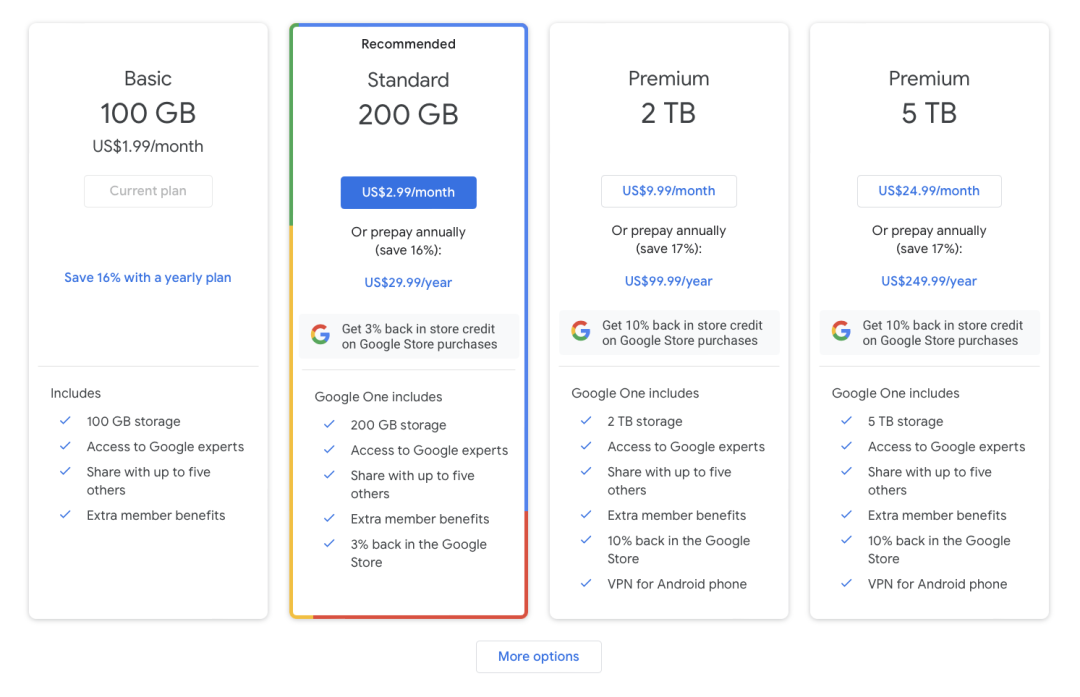 尽管我的设备间云服务的需求大多集中在照片和文档这很基础的两方面,在体验了数种跨 Android 、 iOS 和 macOS 的云服务平台后,还是谷歌提供的服务最接近我心目中的理想方案。去年 5 月入手了 Pixel 3 之后,我的主力拍照设备就从 iPhone 变成了 Pixel ,而亲儿子自带谷歌相册无限容量备份即将在今年 1 月 31 日迎来终结,在对比了 iCloud 网页版的糟糕体验之后,本着未雨绸缪的心态订阅了谷歌对数项业务进行整合之后的 Google One ——一项对云端硬盘、谷歌相册和 Gmail 等提供容量扩展和手机备份的服务,其中 100GB 的套餐当前价格为每月 1.99 美元。