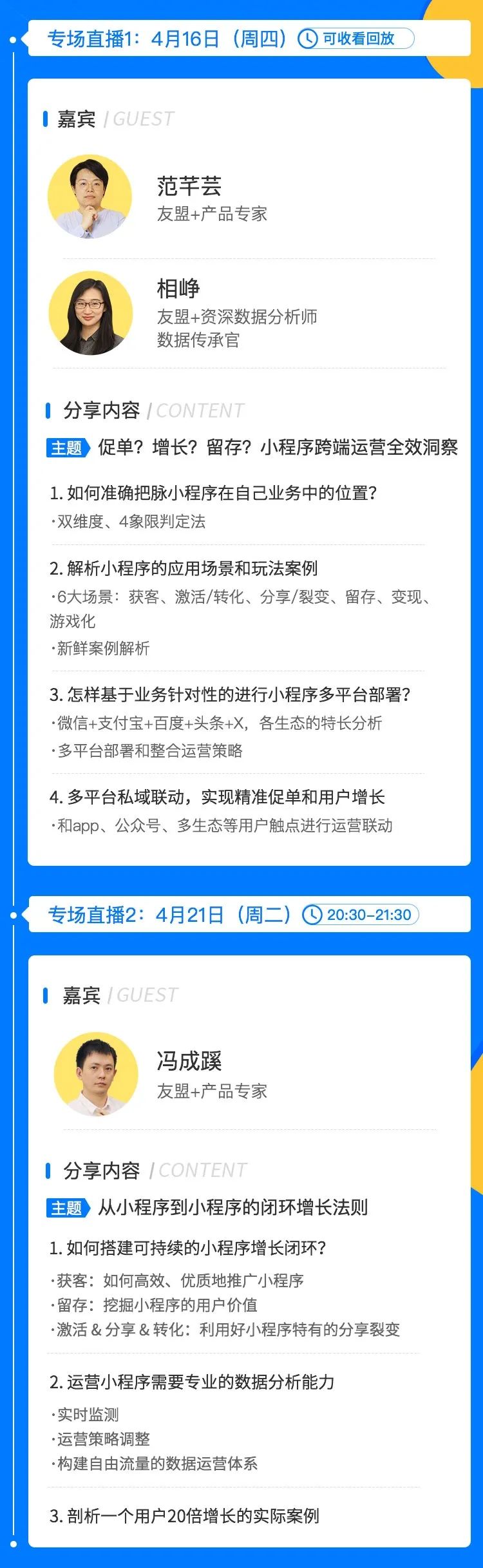 为此,友盟+特别策划了本期小程序专场公开课,邀请了友盟+产品专家@范芊芸、友盟+资深数据分析师、数据传承官@相峥、友盟+产品专家@冯成蹊3位嘉宾,通过友盟+小程序统计业务的案例拆解,来聊聊小程序的跨端运营,以及小程序的闭环增长法则。