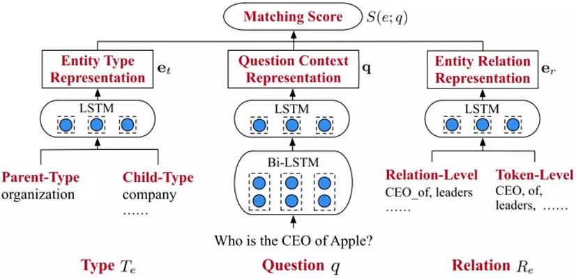 其三,是实体关系编码器,即对于某个候选实体 e,得到其所有实体关系,并表示成向量。此外,对于实体关系,将其关系名切割为 tokens,并以词向量表示。然后将实体关系和实体关系名这两种向量,输入一个 LSTM 中进行编码,得到实体关系的d维向量 er。