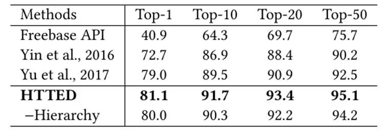 这篇文章,主要有两个主要工作:其一,是引入了层次结构的实体类型约束,来表达实体的语义,使得与问题上下文相关的实体,更容易被找到;其二,是建立了基于 LSTM 的 HTTED 模型,提高了主题实体识别的效果。