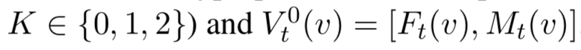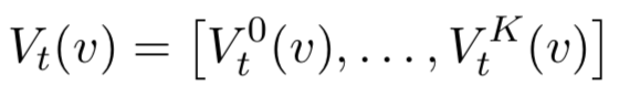 t 时刻知识图谱中每个节点的向量表示为 V_t(v),向量表示中包含了以下来源的信息:代理私有知识库的信息,共享的对话中的信息,来自知识库中相邻节点的信息。