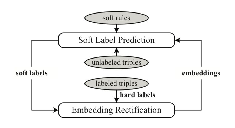 1. 本文提出了一种新的知识图谱表示学习方法 RUGE,RUGE 在向量表示 (embeddings) 的学习过程中迭代地而非一次性地加入了逻辑规则的约束;