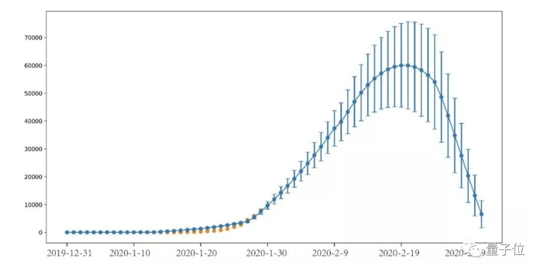 模型的预测结论:基于1月23日以后采取的封城、隔离措施,以及越来越有力的社区级监控措施,我们通过对现有隔离、检测、治疗手段的估计(最乐观的估计和一般估计),并且考虑到春运返程客流的影响,预测全国感染人数将在2月12-19日内达到峰值,在2月16日前后出现疫情拐点,累积确诊人数最高值为4.2万-6万,之后逐渐降低并最终平息。