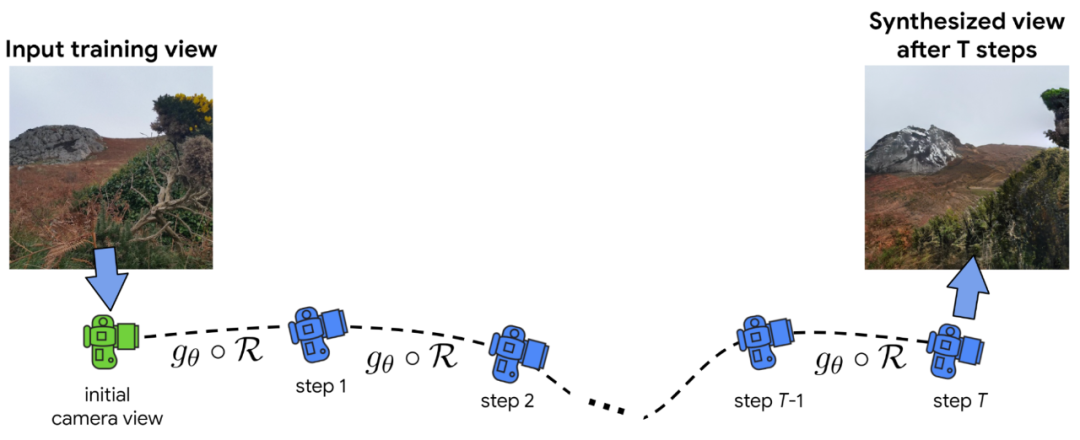 给定一个起始视图,该研究首先要使用单图像深度预测方法计算深度图,然后再使用该深度图将图像向前渲染到新的相机视点,从新视点生成新图像和深度图。