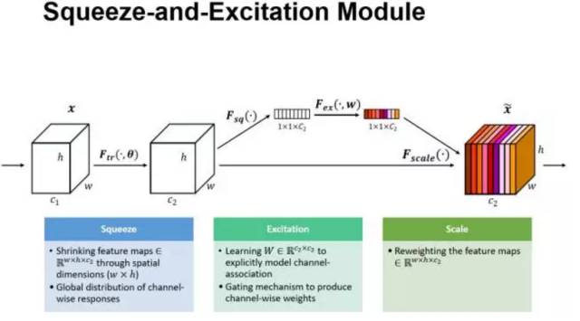 以图中为例,输入X具有C1数目的通道,经过一系列变换得到通道数为C2的SES模块的输入。数据进入SES模块分成两路,如图中,上面一路进行squeeze-excitation,Scale操作,下面一路进行传统的卷积操作。在上面一路中,首先是Squeeze操作,沿着通道C2方向,采用Global Average pooling操作,把尺寸c2 X h X W的输入pooling成一个c2 X 1 X 1的输出,即把每一个二维的特征图转换成一维的实数。Global Average pooling相当于一个全局的感受野,可以获取h X W整张图片信息,对应的标量输出可以代表整张图全局分布。然后进行Excitation操作,借鉴RNN中的Gate机制,为每一个通道赋予一个可训练的权重W,通过W的学习,来建模通道间的重要性。最后是一个Sacle操作,通过Reweight操作把学习的到权重得到传统的卷积得到的通道输出上,得到通道的输出特征的重标定操作。