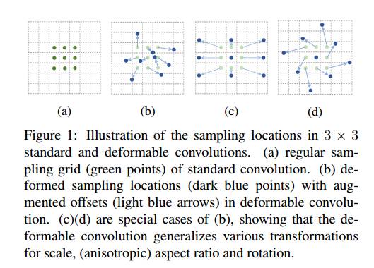 如上图所示,网络会根据原始的卷积,如图a所示,学习一个offset偏量,通过一些列的旋转、尺度变换、缩放等Transform变换,改变成成任意形状的卷积核,如b、c、d图所示。