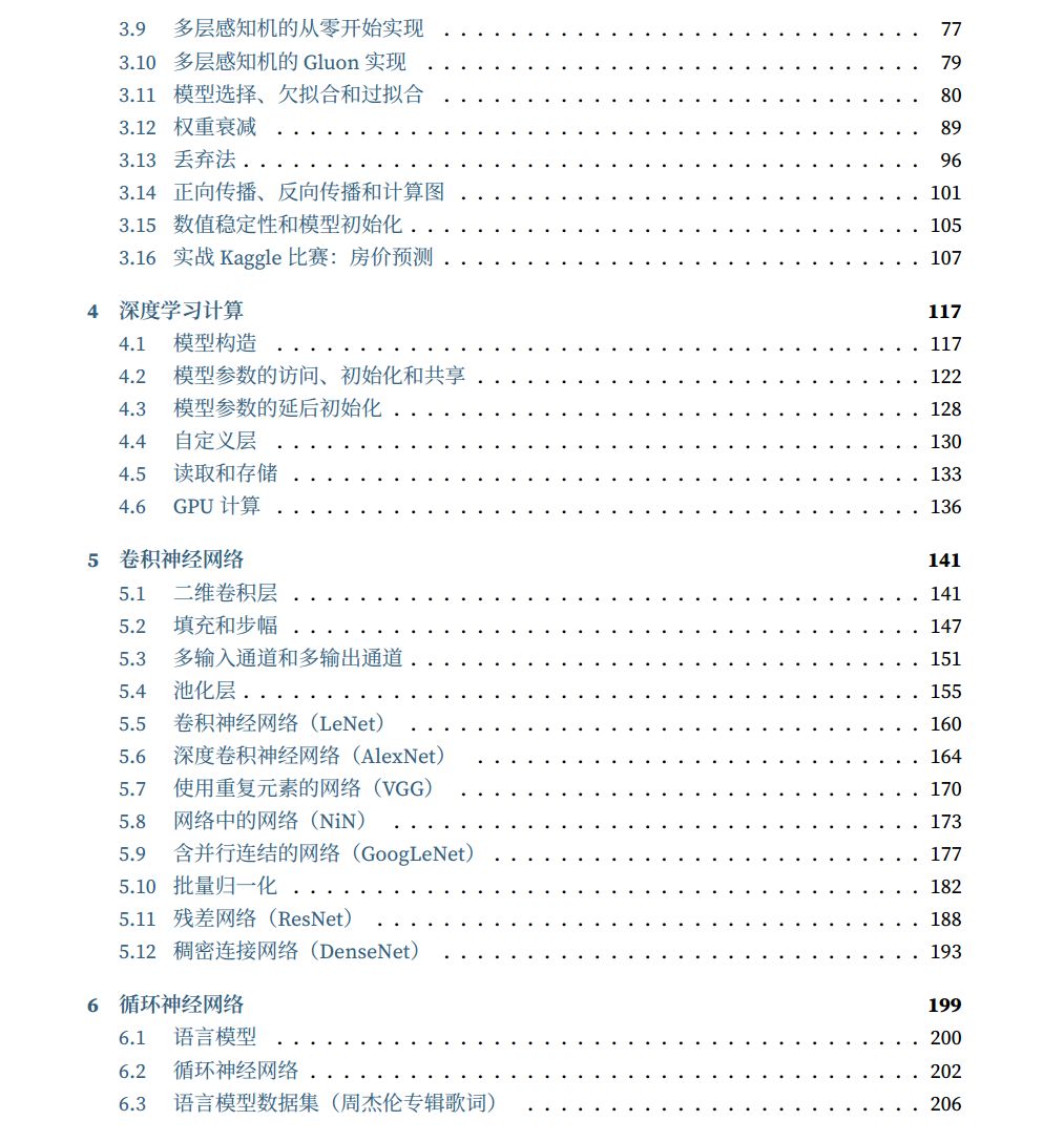 • 第⼀部分(第 1 章⾄第 3 章)涵盖预备⼯作和基础知识。第 1 章介绍了深度学习的背景和本书的使⽤⽅法。第 2 章提供了动⼿学深度学习所需要的预备知识,例如如何获取并运⾏书中的代码。第 3 章包括了深度学习最基础的概念和技术,例如多层感知机和模型正则化。如果你时间有限,并且只希望了解深度学习最基础的概念和技术,那么你只需阅读第⼀部分。