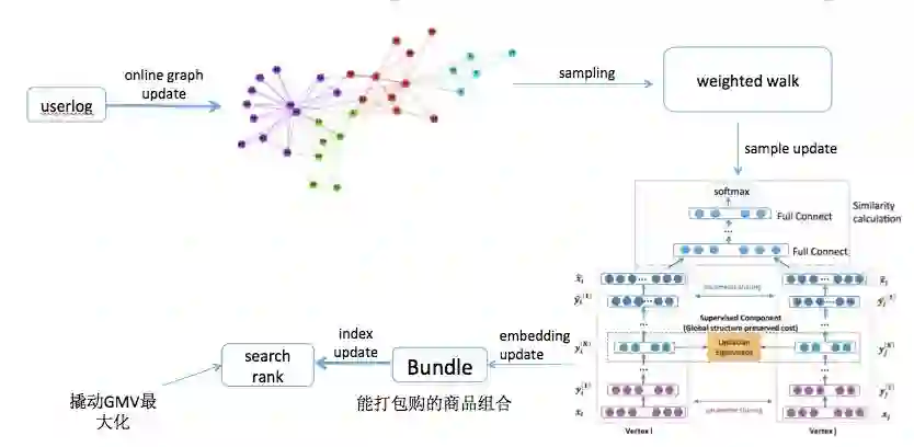 三是,embedding部分将无监督模型升级成有监督模型,将基于weighted walk采出来的序,构造成item-item的pair对,送给有监督模型(DNN)训练。下图是算法框架图。