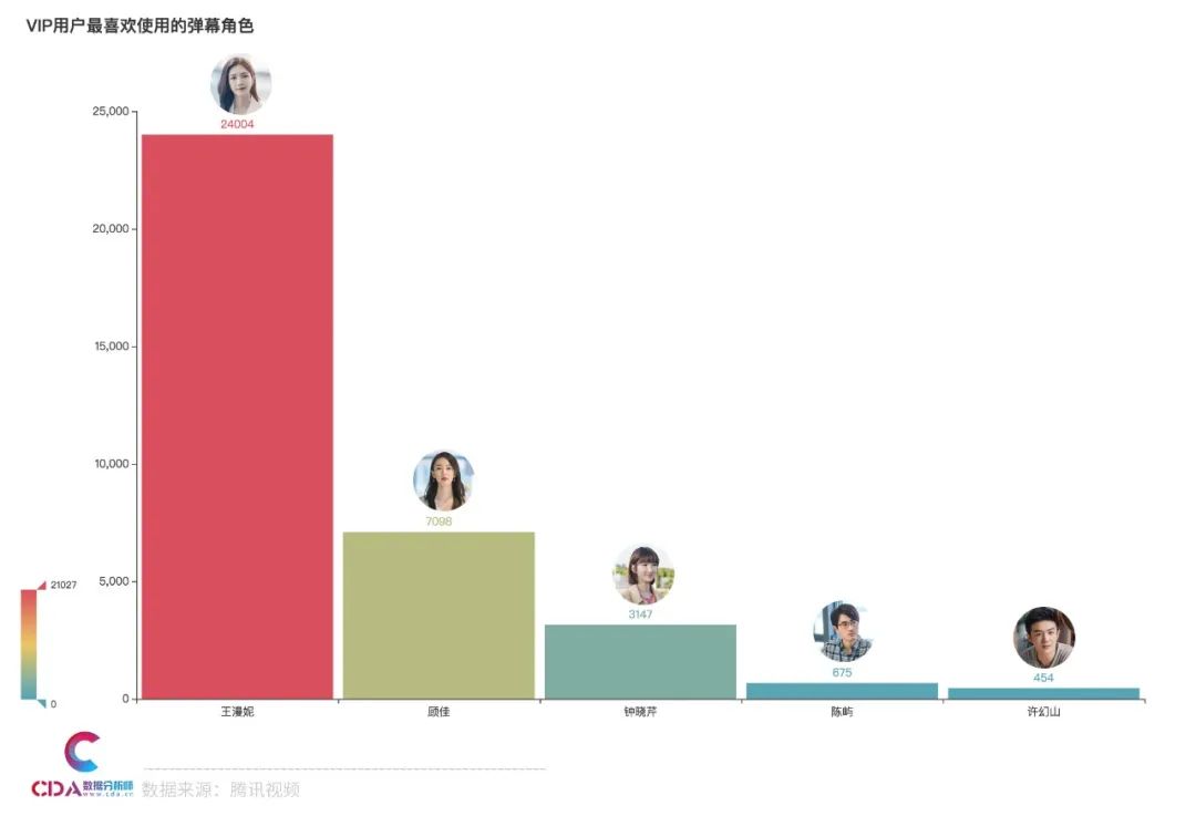 # 柱形图bar1 = Bar(init_opts=opts.InitOpts(width='1350px', height='750px'))bar1.add_xaxis(role_num.index.tolist())bar1.add_yaxis("", role_num.values.tolist(), category_gap='5%')bar1.set_global_opts(title_opts=opts.TitleOpts(title="VIP用户最喜欢使用的弹幕角色"), visualmap_opts=opts.VisualMapOpts(max_=21027), )bar1.render()