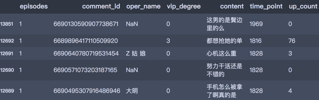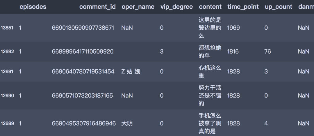 # 读入数据data_list = os.listdir('../data/')df_all = pd.DataFrame()for i in data_list:# 判断if i.split('.')[-1] == 'csv':df_one = pd.read_csv(f'../data/{i}', engine='python', encoding='utf-8', index_col=0)df_all = df_all.append(df_one, ignore_index=False)df_all.info()<class 'pandas.core.frame.DataFrame'>Int64Index: 271049 entries, 0 to 17637Data columns (total 7 columns):# Column Non-Null Count Dtype--- ------ -------------- -----0 episodes 271049 non-null int641 comment_id 271049 non-null int642 oper_name 139035 non-null object3 vip_degree 271049 non-null int644 content 271049 non-null object5 time_point 271049 non-null int646 up_count 271049 non-null int64dtypes: int64(5), object(2)memory usage: 16.5+ MB