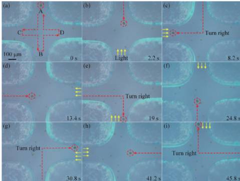 图1 藻类细胞机器人在微流控管道十字路口“右转”运动