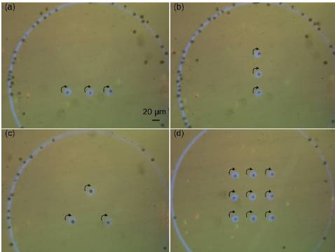 除了控制藻类细胞机器人定向运动,我们又进一步实现了藻类细胞机器人的阵列化旋转。结合光诱导介电泳技术(ODEP),建立了藻类细胞在ODEP微环境中的转动状态模型和受力模型,实现了对藻类细胞的快速捕获及阵列化旋转,且通过改变光强可有效调节细胞旋转速度,如图2。构建的藻类细胞旋转阵列有望作为微尺度马达阵列,在微流控及生物驱动领域发挥重要作用。