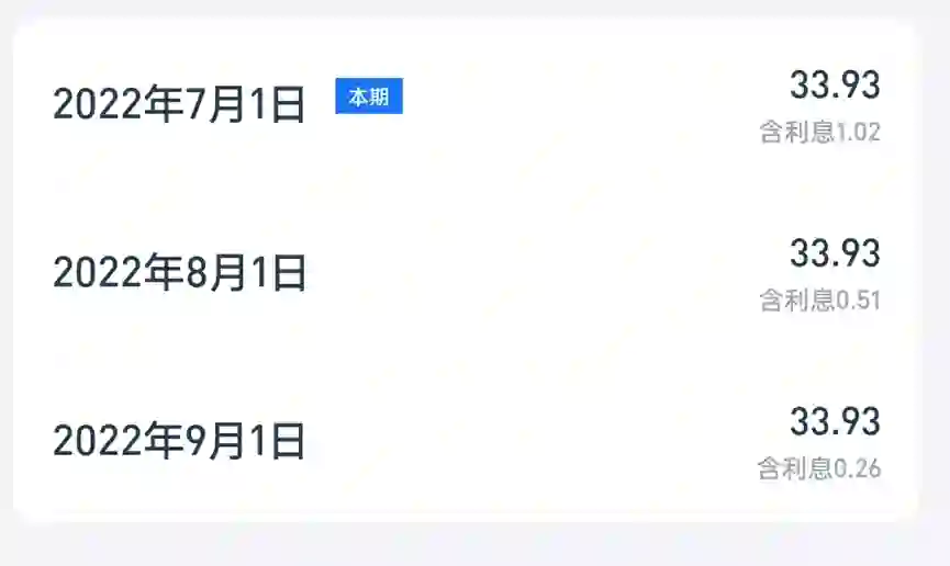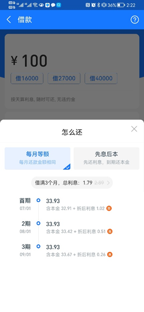 当我借100元,借款3个月,并且选择每月等额,即等额本息的时候,我每个月需要还款33.93元。