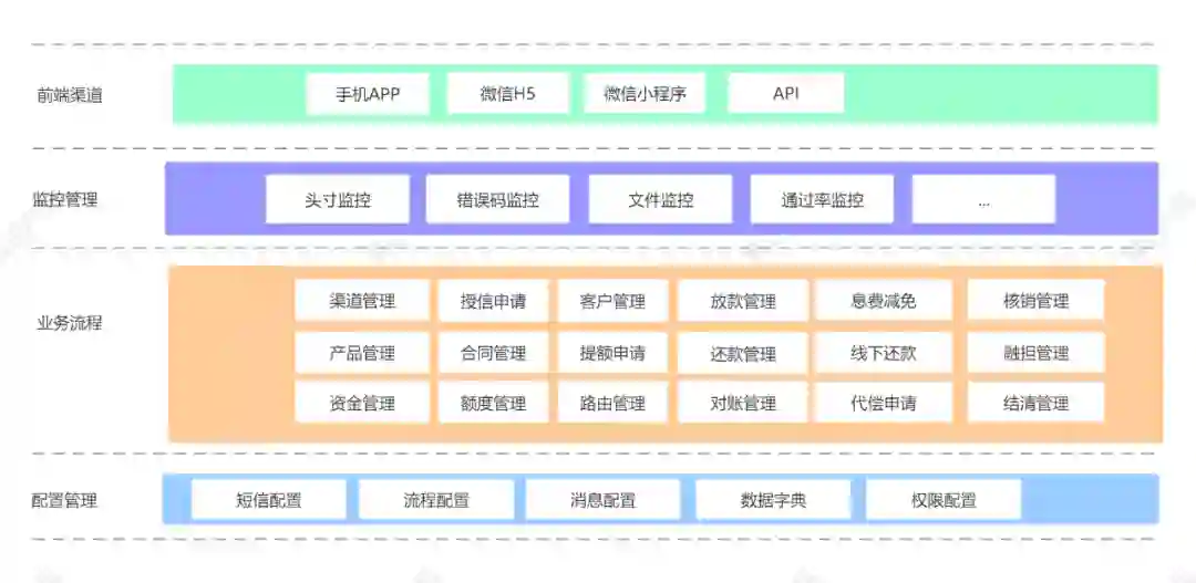 如果一家金融机构还有多个产品,那么就需要有额度系统专门管理额度,因为额度也是有生命周期的,短则一年,长则三五年,而且客户逾期,全部归还欠款的场景下,额度可能生成、占用、和释放,这就需要一个统一的额度管理系统承接。