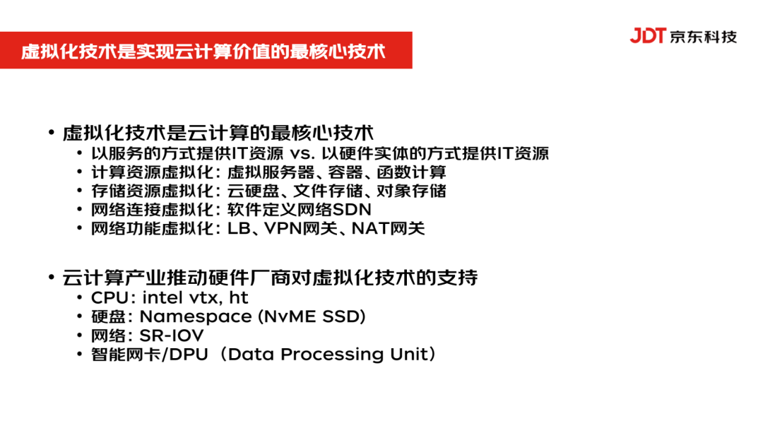 虚拟化技术是实现云计算价值的最核心的技术,它的技术也包括方方面面,云计算最主要的是计算资源、存储资源、网络资源虚拟化。同时,由于云计算的发展,虚拟化技术也推动硬件厂商专门提供了对于虚拟化技术的支持。比如从 CPU 角度来说,它提供了硬件虚拟化的技术,如超线程、虚拟化的全线运行环境;从存储和网络的角度来说,它虚拟化成多个硬件向计算机来提供硬件资源。