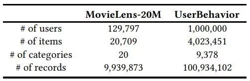 作者们在 MovieLens-20M 数据集上,以及根据部分真实淘宝用户进行了测试。数据规模如下图。
