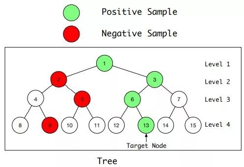 在训练时,用户实际没有进行互动的节点也就可以随机选择一部分作为训练中的负例。这种随机选择作为负例的做法还有一个好处,相比 hierarchical softmax 树中训练模型分辨最优和次优节点,随机选择的负例会让每个节点的辨别器都成为当前层中的全局辨别器,即便当上一层的辨别器出了问题、选择了一些不好的子节点时,下一层的辨别器也有能力把所有这些子节点中好的那一部分挑出来。