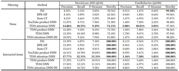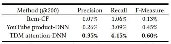 参与对比的基准模型包括 FM 矩阵分解、BPR-MF 隐式反馈推荐矩阵分解、 ItemCF 基于物品的协同过滤算法、YouTube product-DNN。TDM 的变种则包括去掉注意力模块、使用和 YouTube product-DNN 同样的内积方法的 TDM product-DNN,仅去掉激活模块的 TDM DNN,以及使用 hierarchical softmax 树的 TDM attention-DNN-HS。