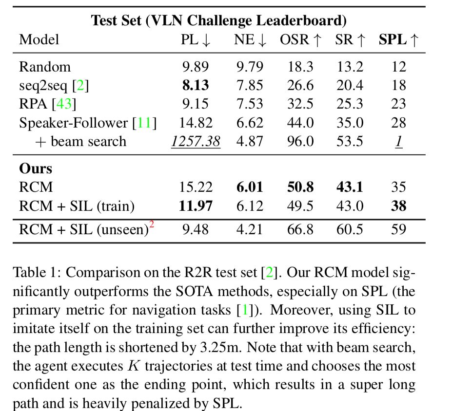 RCM 模型主要由两个模块构成:推理导航器和匹配度评估器。如图所示,通过训练其中绿色的导航器,让它学会理解局部的跨模态场景,推断潜在的指令,并生成一系列动作序列。另外,论文还设置了匹配度评估器(Matching Critic)和循环重建奖励机制,用于评价原始指令与导航器生成的轨迹之间的对齐情况,帮助智能体理解语言输入,并且惩罚不符合语言指令的轨迹。