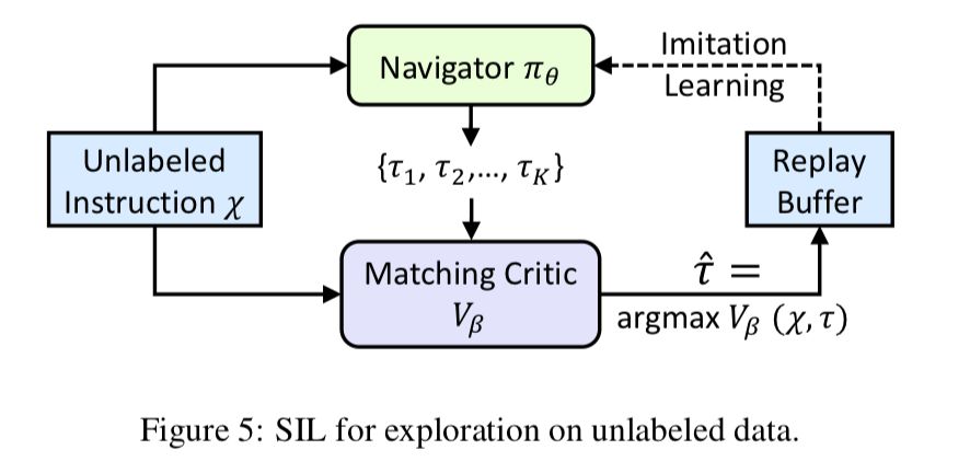 为了解决第三个难点,论文提出了一种自监督模仿学习(Self-supervised Imitation Learning, SIL),其目的是让智能体能够自主的探索未知的环境。其具体做法是,对于一个从未见过的语言指令和目标位置,导航器会得到一组可能的轨迹并将其中最优的轨迹(采用匹配度评估器)保存到缓冲区中,然后匹配度评估器会使用之前介绍的循环重建奖励机制来评估轨迹,SIL方法可以与多种学习方法想结合,通过模仿自己之前的最佳表现来得到更优的策略。