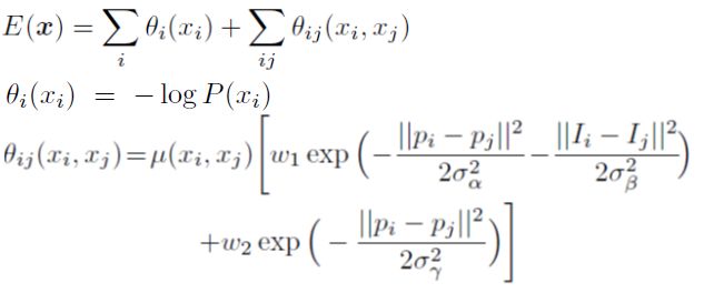 对于第二项,θij,它是一个滤波器。当xi != xj时,μ= 1。当xi = xj时,μ= 0。在括号中,它是两个内核的加权和。第一个核取决于像素值差和像素位置差,这是一种双边的filter。双边滤波器具有保留边缘的特性。第二个内核仅取决于像素位置差异,这是一个高斯滤波器。那些σ和w,通过交叉验证找到。迭代次数为10。