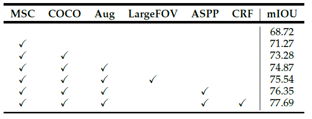 在PASCAL VOC 2012验证集中使用ResNet-101的每个模型组件的结果