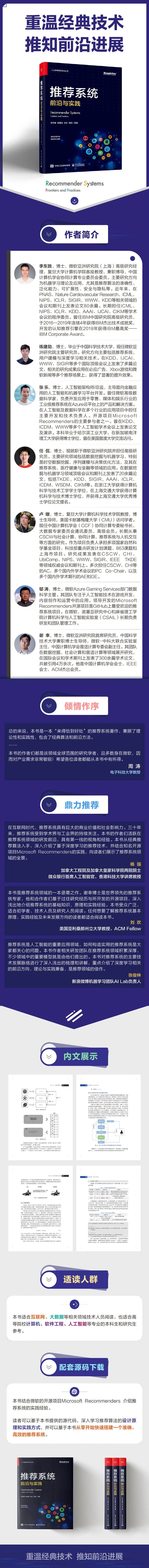本书作者以第一线的视角和经验对推荐系统进行总结,尝试从原理与实践两个角度向读者剖析推荐系统。在原理方面,本书介绍各类经典推荐算法以及前沿的深度学习推荐算法,涵盖深度协同过滤、特征交互、基于图神经网络的推荐、序列与会话推荐、结合知识图谱的推荐和基于强化学习的推荐等重要技术,探讨推荐算法研究在对话、因果、常识等方面的前沿话题,分析推荐系统在数据融合、系统扩展、性能评估等方面的关键挑战,并探讨如何设计负责任的推荐系统等。在实践方面,本书结合微软的开源项目Microsoft Recommenders介绍推荐系统的实践经验,读者可以基于本书提供的源代码,深入学习推荐算法的设计原理和实践方式,并可以基于本书从零开始快速搭建一个准确、高效的推荐系统。