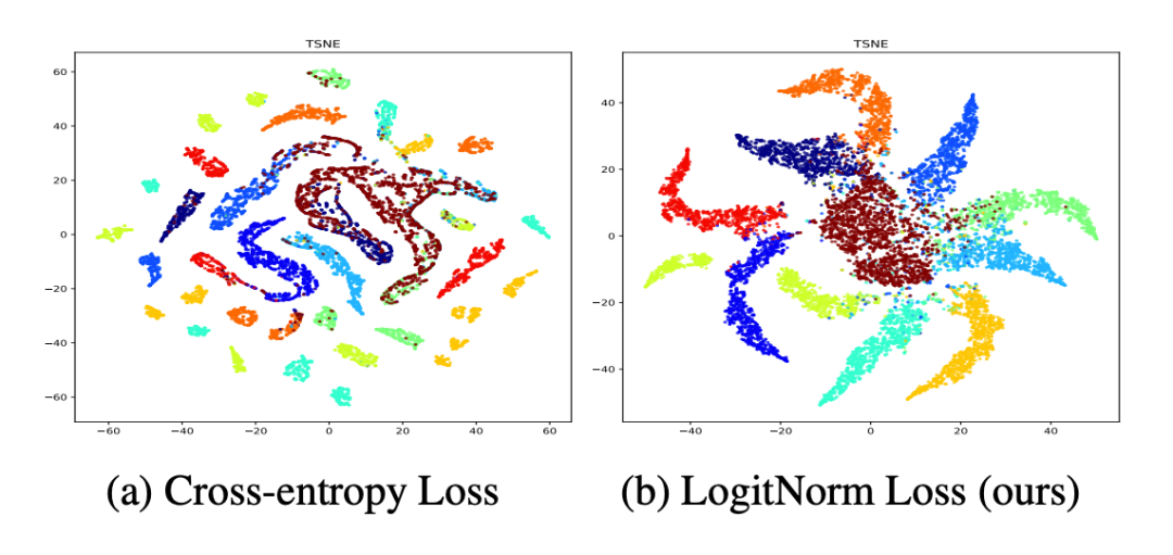 具体地,作者在计算 softmax 交叉熵之前做了一个 Logit Normalization 操作,鼓励 Logit 向量的方向与它的 one-hot 标签一致,但是不优化 Logit 的大小(限定为一个常数)。特别地,理想情况希望 Logit 向量优化为一个常数大小的单位向量。LogitNorm 交叉熵的数学形式如下: