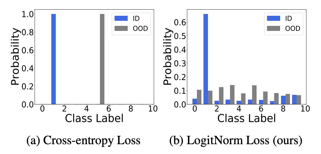 下图进一步展示了 IND 和 OOD 数据的 softmax 置信度分数分布,可以看出传统交叉熵会导致大多数 OOD 样本被分配一个较高的置信度分数,而 LogitNorm 可以更好地区分 IND 和 OOD。