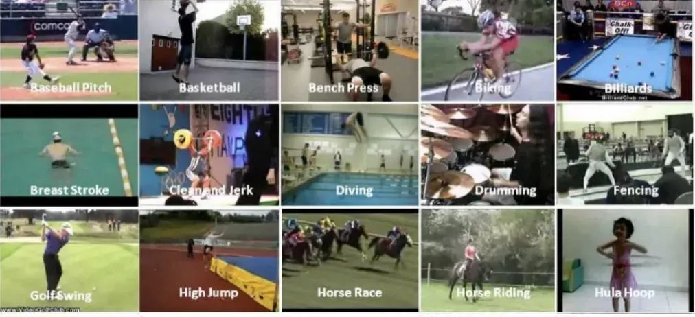 由布朗大学发布的人类动作视频数据集,该数据集视频多数来源于电影,还有一部分来自公共数据库以及YouTube等网络视频库。数据库包含有6849段样本,分为51类,每类至少包含有101段样本。