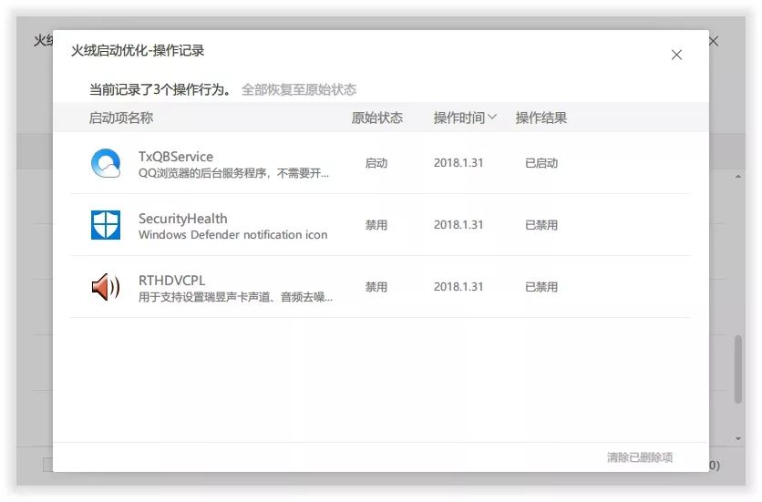 用户需要查看通过火绒安全优化过的启动项和服务项,点击「操作记录」后将弹出记录窗口,标记了曾经操作的记录信息,用户也可以一键恢复各个项目的原始状态,这一功能方便了以后操作失误时进行撤销恢复。