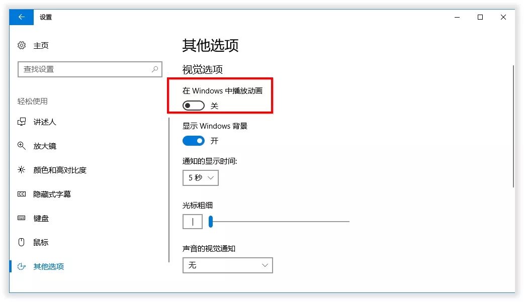 Windows 10 系统的用户还可打开设置窗口,选择「轻松使用 - 其他选项」,关闭「在 Windows 中播放动画」。