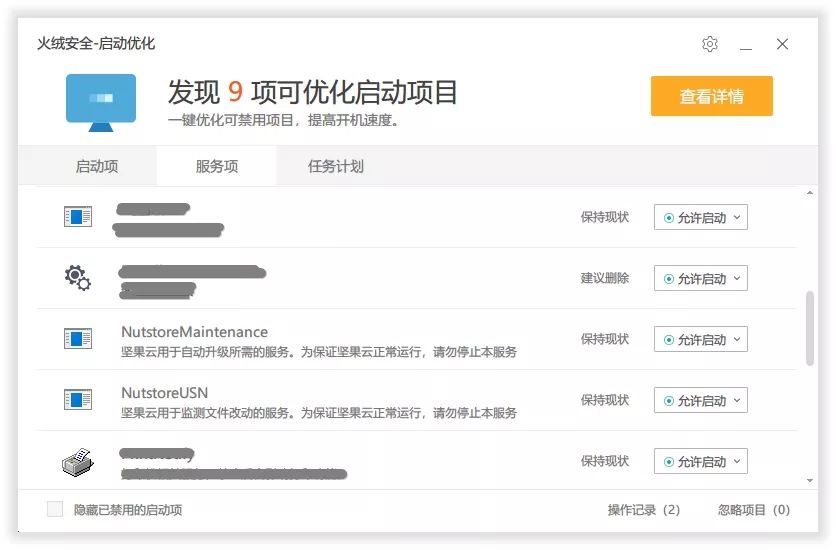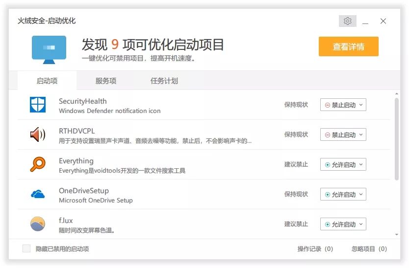 不喜欢折腾的用户可以选择第三方工具提供的优化策略,比如火绒安全的启动优化提供了一键优化功能,还可以回看操作记录、设置忽略项目。