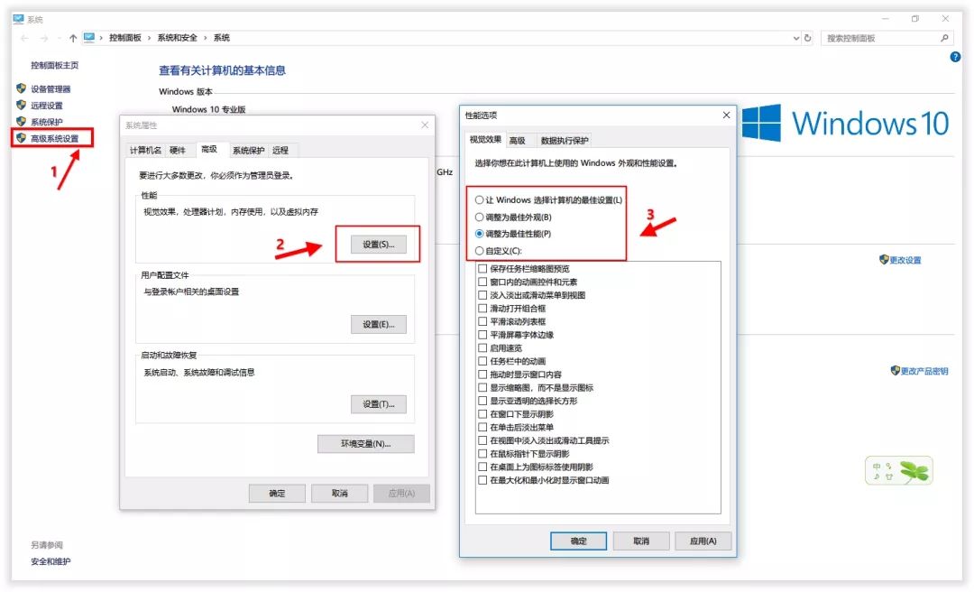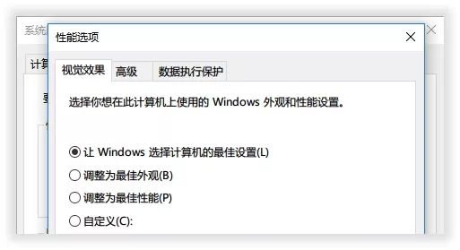 右键点击「我的电脑(或此电脑)」,选择「属性 - 高级系统设置 - 高级 - 点击性能区域的设置按钮」,切换视觉效果标签页,选择「调整为最佳性能」,点击确定保存。或者选择自定义,将不需要的特效功能勾选去掉,再点击确定。