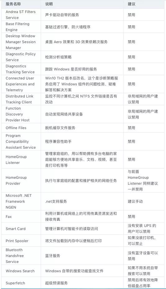 下面是我收集网上和个人使用经验后,用户可以选择手动或禁用的服务列表: