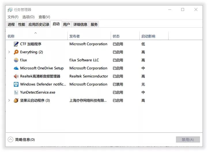 如果属于非 Windows 10 系统打开任务管理器,依次使用 Win+R 组合键打开运行框,输入 msconfig 后将打开系统配置的窗口,切换启动标签页,即可对系统启动项进行管理。