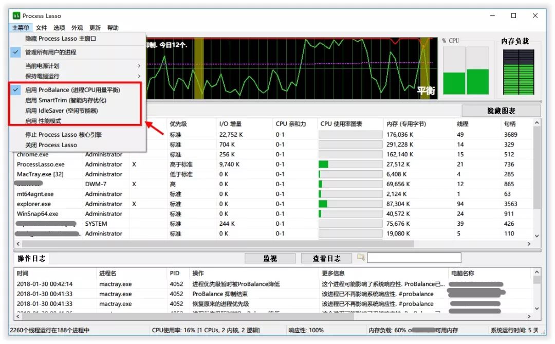 在系统后台进程优化上,Process Lasso 会以 ProBalance 平衡模式作为默认的优化策略,主要以平衡电脑 CPU 占用情况作为考量指标。用户还可以为每一个进程分配优先级,查看到每一个进程的启动时间和文件位置,也可以干脆结束占用大量资源的进程。