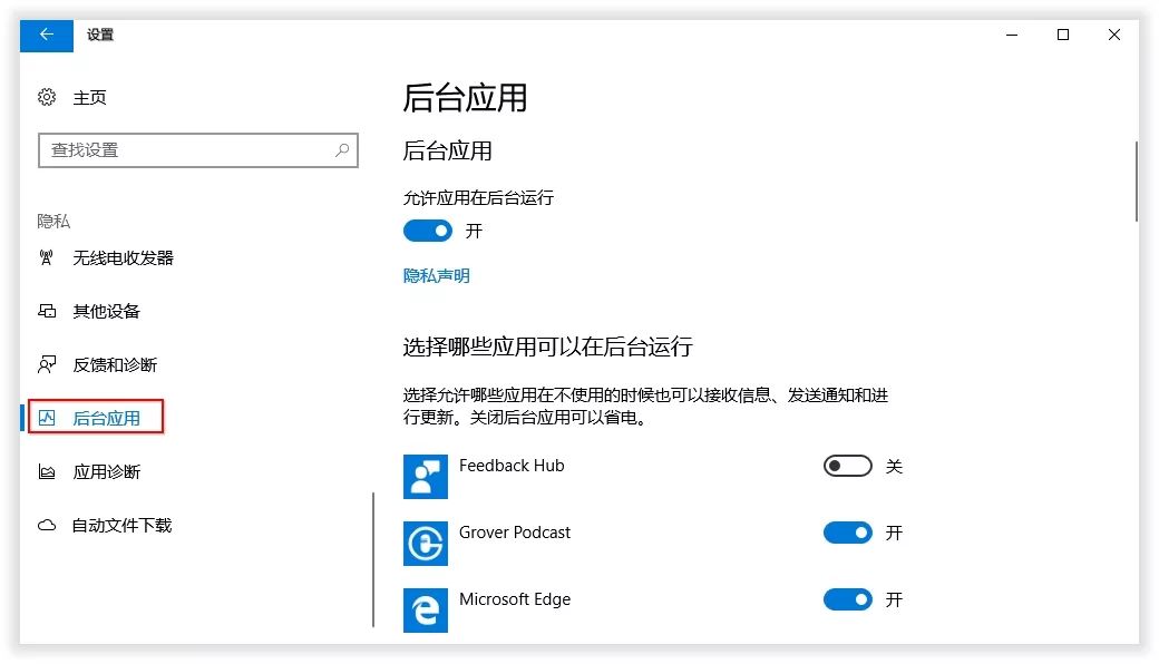 依次打开「设置 - 隐私 - 后台应用」,用户可以选择允许哪些应用在不使用的时候仍然可以接收信息、发送通知和进行更新,这里列出的应用是 Windows 10 系统本身内置以及通过微软商店下载的 UWP 应用。