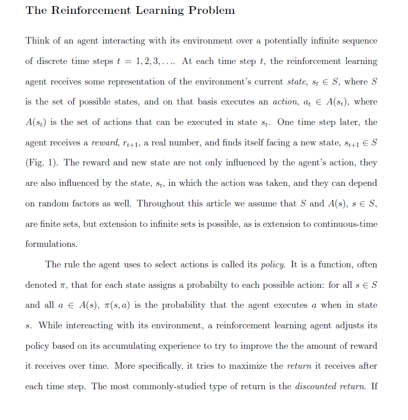 强化一词来源于实验心理学中对动物学习的研究,它指的是某一事件的发生,与某一反应之间有恰当的关系,而这一事件往往会增加该反应在相同情况下再次发生的可能性。虽然心理学家没有使用“强化学习”这个术语,但它已经被人工智能和工程领域的理论家广泛采用,用来指代基于这一强化原理的学习任务和算法。最简单的强化学习方法使用的是一个常识,即如果一个行为之后出现了一个令人满意的状态,或者一个状态的改善,那么产生该行为的倾向就会得到加强。强化学习的概念在工程领域已经存在了几十年(如Mendel和McClaren 1970),在人工智能领域也已经存在了几十年(Minsky 1954, 1961;撒母耳1959;图灵1950)。然而,直到最近,强化学习方法的发展和应用才在这些领域占据了大量的研究人员。激发这种兴趣的是两个基本的挑战:1) 设计能够在复杂动态环境中在不确定性下运行的自主机器人代理,2) 为非常大规模的动态决策问题找到有用的近似解。